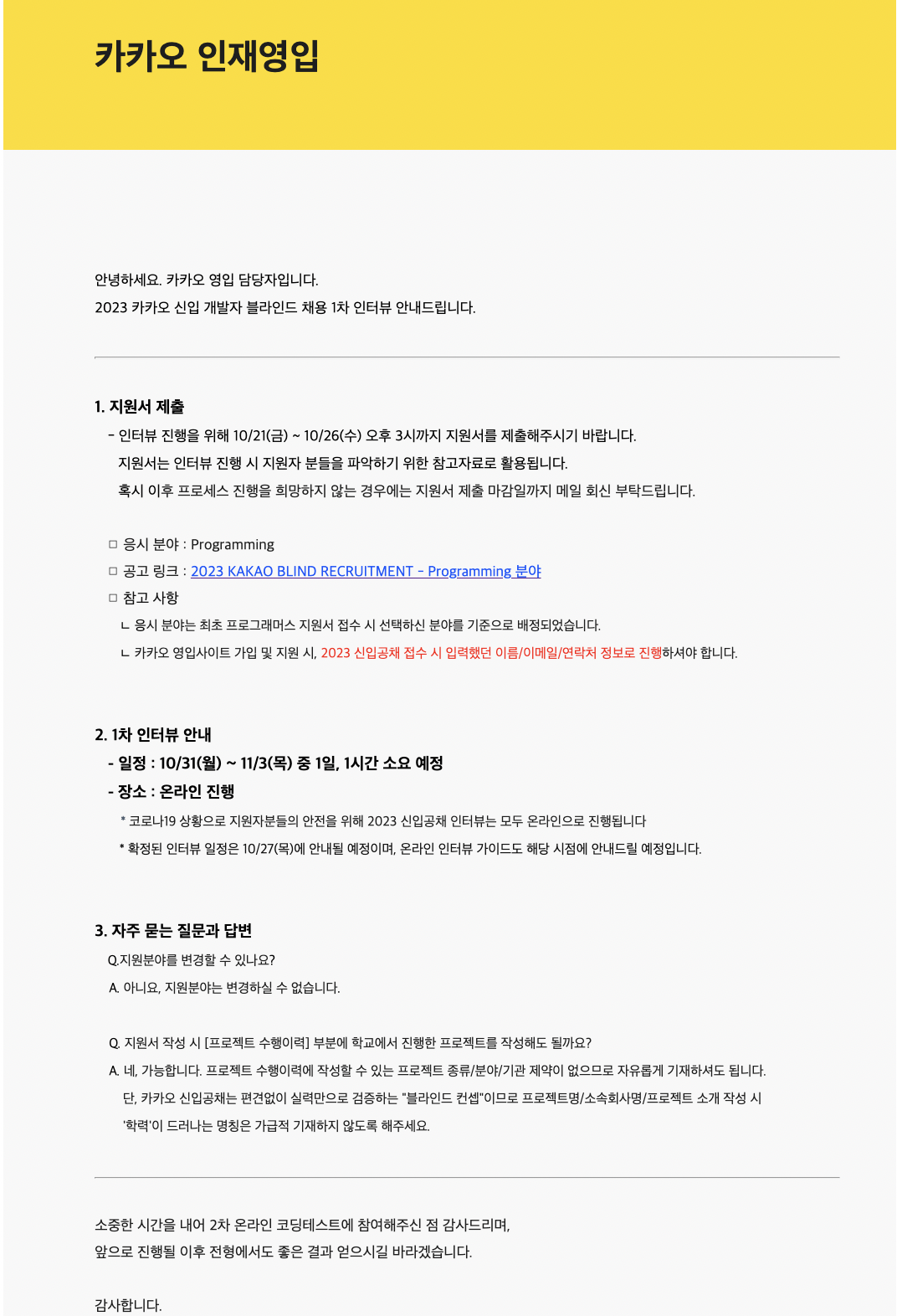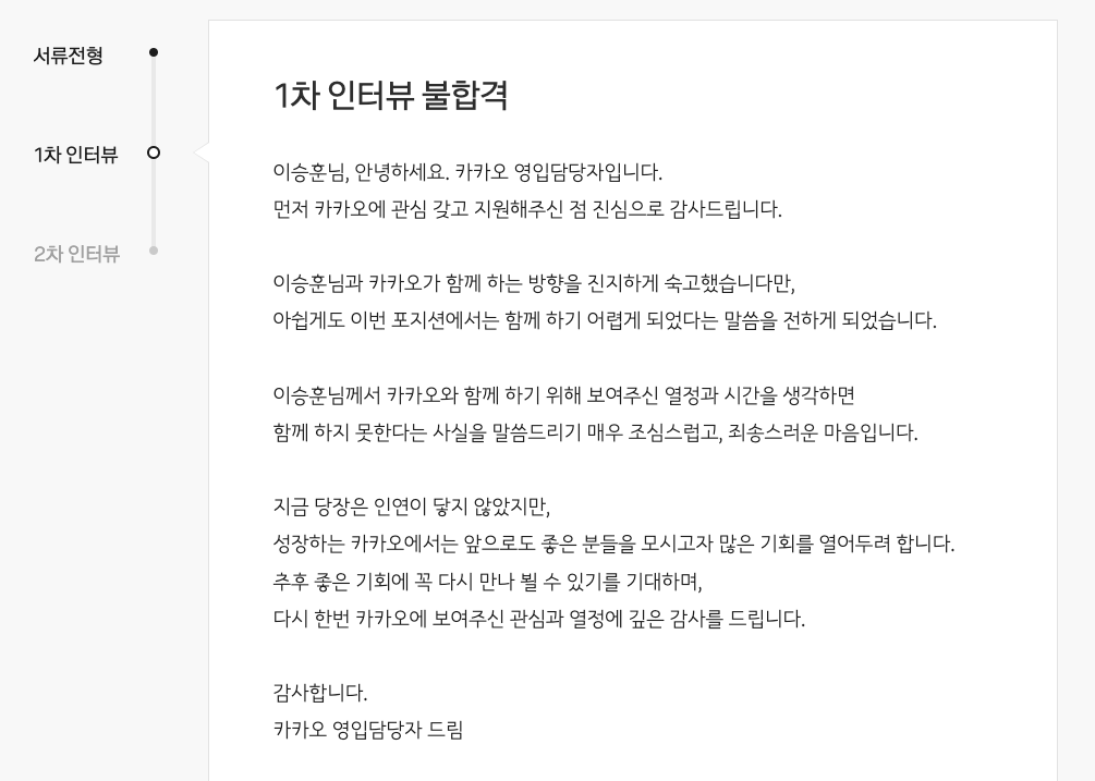 ๋ค๋ฅธ ๊ธฐ์ ๋ฉด์ ๋ ์ฌ๋ฌ๋ฒ ๋ดค๊ณ , ๋ค๋ฅธ ๊ธฐ์ ๋ฉด์ ๊ด๋๋ค๋ ์ ๋ํด์ฃผ์ จ์ง๋ง, ๊ทธ๋๋ ๋ญ๊ฐ ๊ฐ์ฅ ์น์ ํ๋ ๋ฉด์ ๊ฒฝํ์ ์นด์นด์ค์๋ค.