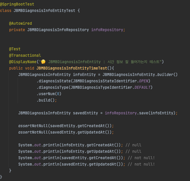 repository๋ฅผ ํตํด save๋ฅผ ํ ํ, createdAt๊ณผ updatedAt์ ๊ฐ์ด notNull์ธ์ง ํ์ธํ๋ ๋ก์ง์ผ๋ก ๊ตฌ์ฑํ์ต๋๋ค.