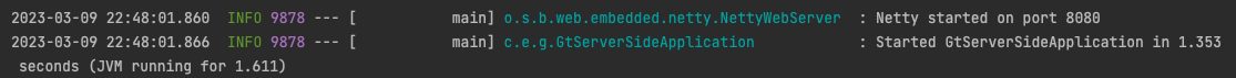 2023-03-09 22:35:17.961 INFO 9784 --- [ main] c.e.g.GtServerSideApplication : Started GtServerSideApplication in 1.682 seconds (JVM running for 2.269)