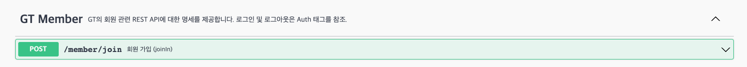 API의 그룹인 'GT Member'를 확인할 수 있고, 옆의 작은 폰트로 설명인 description이 달려있는 모습을 볼 수 있습니다.
