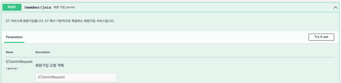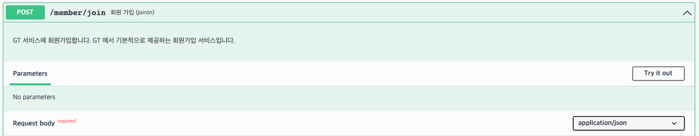 둘 다 String Type으로 입력이 가능하고, 예시로 summary = "회원 가입 (joinIn)", description = "GT 서비스에 회원가입~"와 같이 입력했다면, Swagger UI에는 다음과 같이 출력됩니다.