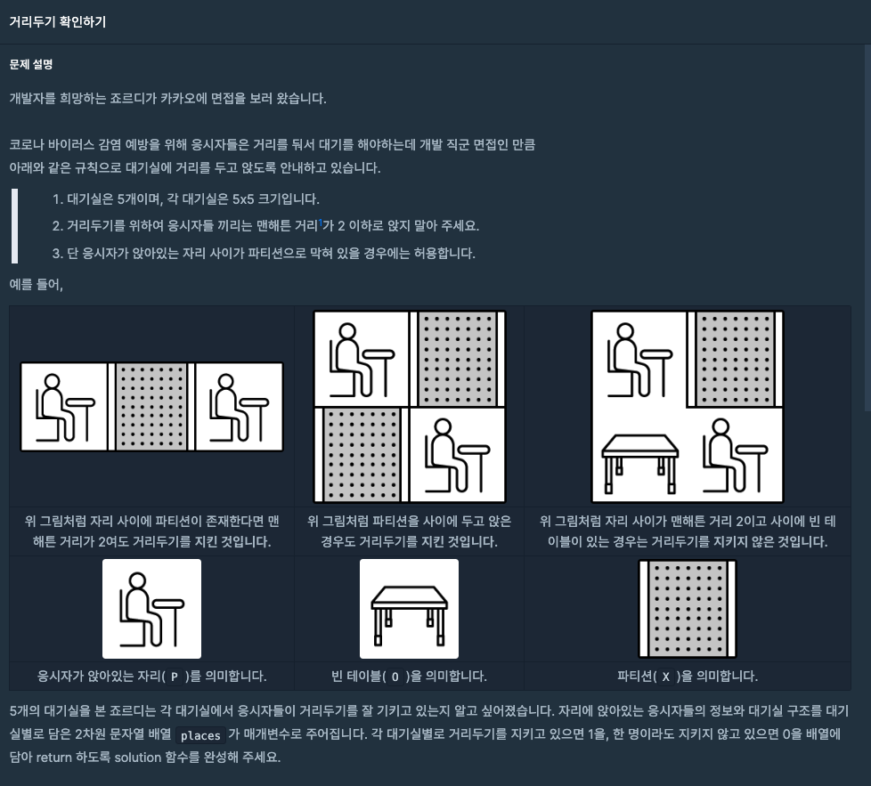 ์ ์ฒด 2์ฐจ์ ๋ฐฐ์ด์ ๊ฐ๋ก ์ธ๋ก์ ๊ธธ์ด๊ฐ 5๋ฐ์ ๋์ง ์์ผ๋, ๋ชจ๋ ์ฌ๋์ ๋ํด์ ๋งจํดํผ ๊ฑฐ๋ฆฌ๊ฐ 2 ์ดํ์ธ ์ฃผ๋ณ์ฌ๋์ด ์๋์ง ๊ณ์ฐํด์ฃผ๋ฉด ๋ฉ๋๋ค.