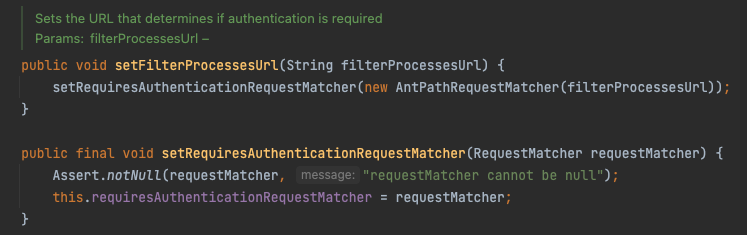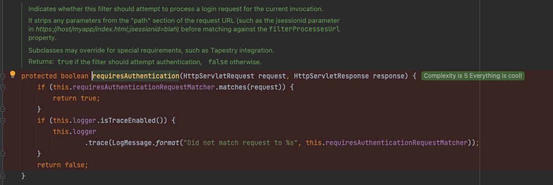requiresAuthentication์ boolean ๋ฆฌํด๊ฐ์ ์ํด ์๋์ attemptAuthentication์ ์คํํ ๊ฒ์ธ์ง, ์๋์ง๊ฐ ๊ฒฐ์ ๋ฉ๋๋ค.