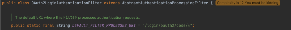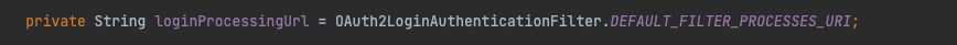 loginProcessUrl์ OAuth2LoginAuthenticationFilter์ DEFAULT\_FILTER\_PROCESSES\_URI์ด๋ฉฐ, ํด๋น ๊ฐ์ "/login/oauth2/code/*"๋ก ๊ณ ์ ๋์ด ์์ต๋๋ค.