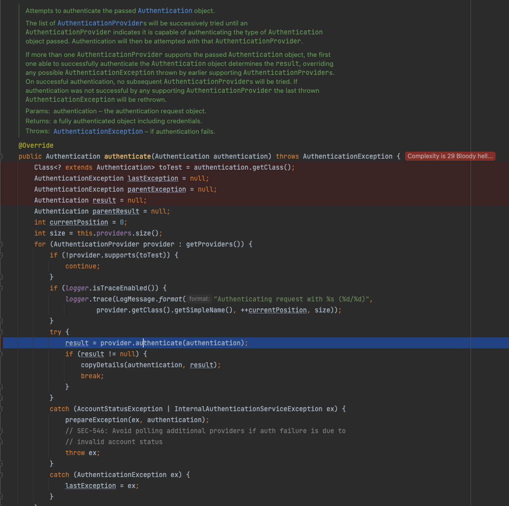 ๊ทธ๋ฆฌ๊ณ ํด๋น authenticate ๋ฉ์๋๋ ProviderManager์ authenticate์์ ํธ์ถํ๊ณ ์์ต๋๋ค.