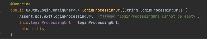 this.requiresAuthenticationRequestMatcher๋ ์์์ ๋ณด์๋ฏ์ด, OAuth2LoginConfigurer.loginProcessUrl์ ์ํฅ์ ๋ฐ์ต๋๋ค.