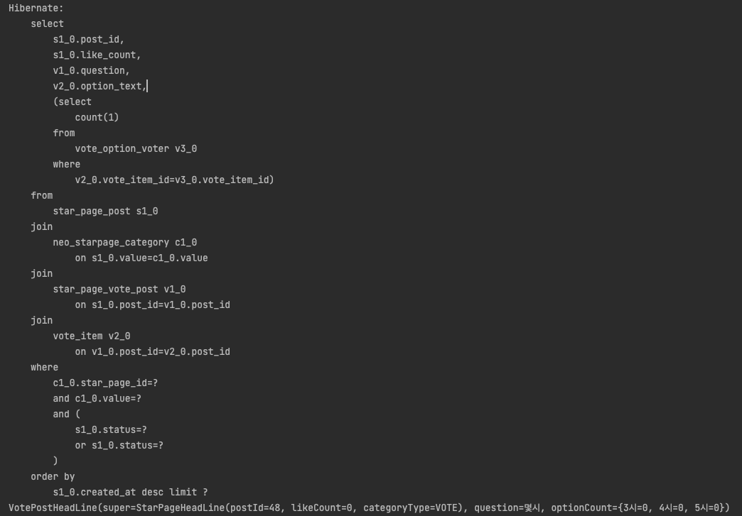 Select ๋ฌธ์ ๋ณด๋ฉด, ์๊ตฌ์ฌํญ์ ๋ง๋ ๊ฐ๋ค์ SELECTํ๊ณ , ์ต์ข ์๋์ ๊ฒฐ๊ณผ๋ฅผ ๋ณด๋ฉด VotePostHeadLine์ ์๋ง๊ฒ Select ํ ๊ฐ์ด transform ๋ ๊ฒ์ ํ์ธํ ์ ์์ต๋๋ค. (option_text์ select count ์๋ธ์ฟผ๋ฆฌ๋ฅผ Map์ผ๋ก ๋ณ๊ฒฝ)