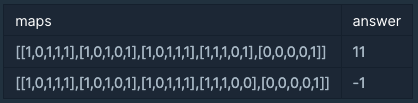 κ²μ λ§΅μ μν mapsκ° λ§€κ°λ³μλ‘ μ£Όμ΄μ§ λ, μΊλ¦ν°κ° μλ ν μ§μμ λμ°©νκΈ° μν΄μ μ§λκ°μΌ νλ μΉΈμ κ°μμ μ΅μκ°μ return νλλ‘ solution ν¨μλ₯Ό μμ±ν΄μ£ΌμΈμ. λ¨, μλ ν μ§μμ λμ°©ν μ μμ λλ -1μ return ν΄μ£ΌμΈμ.