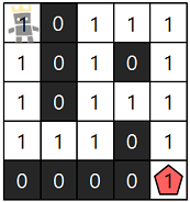 μ§κΈλΆν° λΉμ μ ν νμ νμμ΄ λμ΄ κ²μμ μ§ννλ €κ³ ν©λλ€. λ€μμ 5 x 5 ν¬κΈ°μ λ§΅μ, λΉμ μ μΊλ¦ν°κ° (ν: 1, μ΄: 1) μμΉμ μκ³ , μλ ν μ§μμ (ν: 5, μ΄: 5) μμΉμ μλ κ²½μ°μ μμμ λλ€.