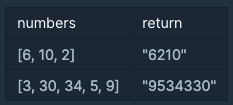 0 ๋๋ ์์ ์ ์๊ฐ ๋ด๊ธด ๋ฐฐ์ด numbers๊ฐ ๋งค๊ฐ๋ณ์๋ก ์ฃผ์ด์ง ๋, ์์๋ฅผ ์ฌ๋ฐฐ์นํ์ฌ ๋ง๋ค ์ ์๋ ๊ฐ์ฅ ํฐ ์๋ฅผ ๋ฌธ์์ด๋ก ๋ฐ๊พธ์ด return ํ๋๋ก solution ํจ์๋ฅผ ์์ฑํด์ฃผ์ธ์.