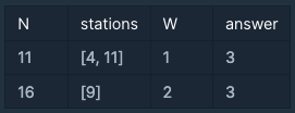 ์ํํธ์ ๊ฐ์ N, ํ์ฌ ๊ธฐ์ง๊ตญ์ด ์ค์น๋ ์ํํธ์ ๋ฒํธ๊ฐ ๋ด๊ธด 1์ฐจ์ ๋ฐฐ์ด stations, ์ ํ์ ๋๋ฌ ๊ฑฐ๋ฆฌ W๊ฐ ๋งค๊ฐ๋ณ์๋ก ์ฃผ์ด์ง ๋, ๋ชจ๋ ์ํํธ์ ์ ํ๋ฅผ ์ ๋ฌํ๊ธฐ ์ํด ์ฆ์คํด์ผ ํ ๊ธฐ์ง๊ตญ ๊ฐ์์ ์ต์๊ฐ์ ๋ฆฌํดํ๋ solution ํจ์๋ฅผ ์์ฑํด์ฃผ์ธ์