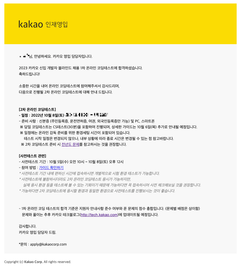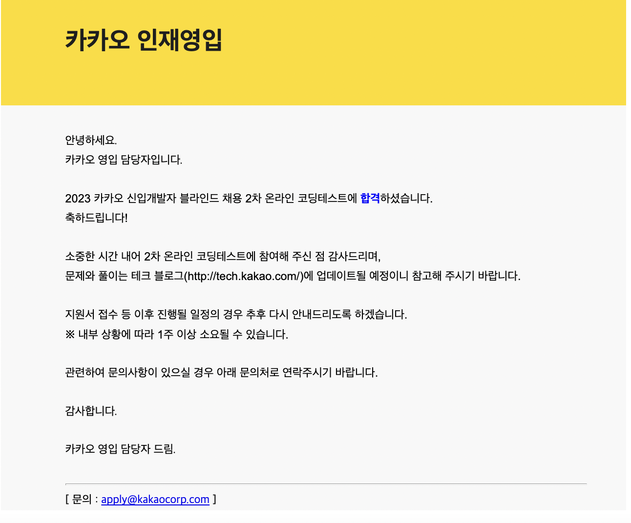 2023 ์นด์นด์ค ๋ธ๋ผ์ธ๋ ๊ฐ๋ฐ์ ์ฑ์ฉ ๊ณต์ฑ ์ฝ๋ฉํ ์คํธ ํ๊ธฐ