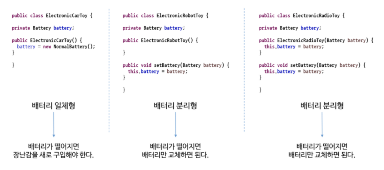 ๋ถ๋ฆฌํ ์ฅ๋๊ฐ์ ์์ฑ์๋ฅผ ํตํด ๋ฐฐํฐ๋ฆฌ๋ฅผ ์ฃผ์ ํ๊ฑฐ๋, setter method๋ฅผ ์์ฑํด ๋ฐฐํฐ๋ฆฌ๋ฅผ ์ฃผ์ ํ๋ค.
