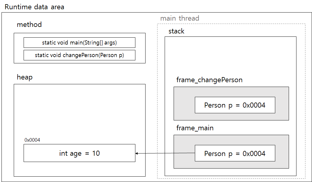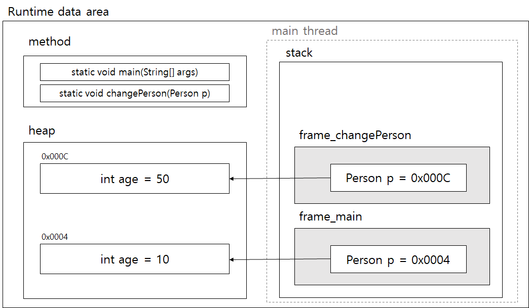 ์์ ๊ทธ๋ฆผ์, changePerson ๋ฉ์๋๊ฐ ๋ง ํธ์ถ๋์์ ๋์ ์ํฉ์ ๋ํ๋ธ๋ค. call by value์ด๋ฏ๋ก, stack ์์ญ์ ์ฐธ์กฐ๋ณ์ p๋ ์ฃผ์๊ฐ์ ๊ทธ๋๋ก ๋ณต์ฌํ์ฌ ๊ฐ๊ฒ ๋๋ค.