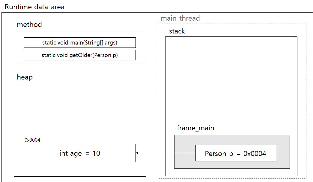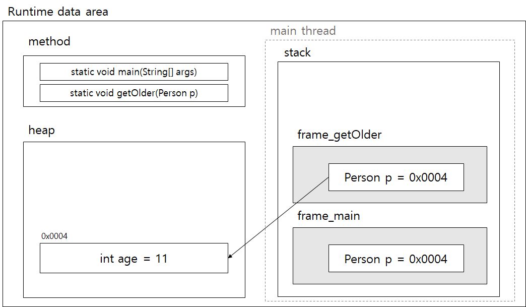 getOlder๋ผ๋ ๋ฉ์๋์ ์ฐธ์กฐ ๋ณ์์ธ p๋ฅผ ์ ๋ฌํ๋ค. ๊ทธ๋ฌ์ p.age์ ๊ฐ์ ๋ฉ์๋์ ๋ค์ด๊ฐ๊ธฐ ์ ์ 10์ด ๋์ค๊ณ , ๋ฉ์๋๋ฅผ ๋น ์ ธ ๋์จ ํ๋ 11์ด ๋์๋ค.