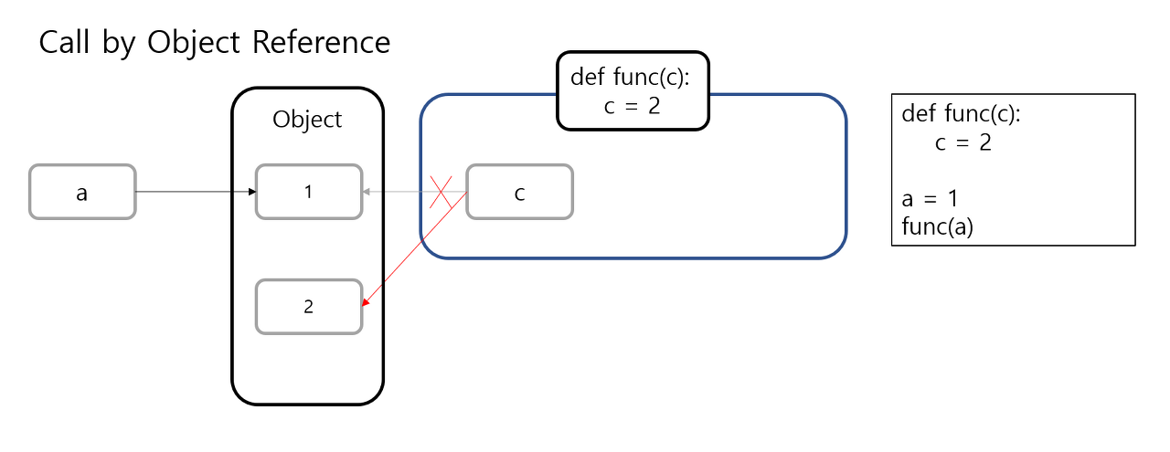 func์ ์ง์ ํ๋ฉด์ 1์ด๋ผ๋ ๊ฐ์ฒด์ c๋ผ๋ ์ด๋ฆํ๋ ๋ฌ๊ฒ ๋๋ค. ๊ทธ๋ฆฌ๊ณ c = 2๋ก ๋ณ๊ฒฝํ๋ฉด, 2๋ผ๋ ๊ฐ์ฒด๊ฐ ์๋ก์ด ์์ฑ๋๊ณ , c ์ด๋ฆํ๋ 2์ ๋ถ๊ฒ ๋๋ค.