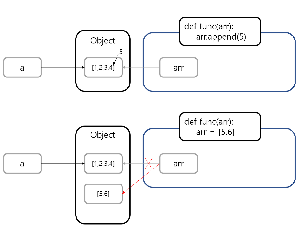arr = [5,6]์ผ๋ก ๋ณ๊ฒฝํ๋ฉด, [5,6]์ด๋ผ๋ ์๋ก์ด ๋ฆฌ์คํธ ๊ฐ์ฒด๊ฐ ์์ฑ๋๊ณ , arr ์ด๋ฆํ๋ ์ด ๋ฆฌ์คํธ๋ก ์ฎ๊ฒจ๊ฐ๋ค.